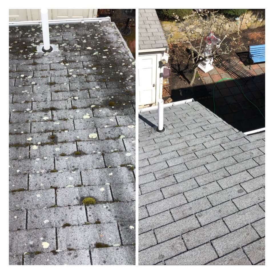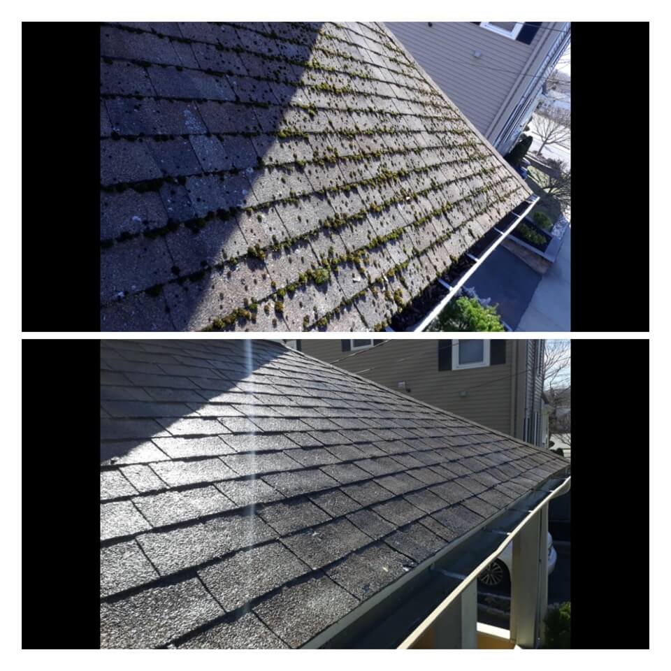 HiCleaners is the most experienced company in Everett, MA that deals with roof washing and roof soft washing. All of our employees are trained to recognize precise solution mixing ratios to provide you with the safest and most effective soft washing service. Roofs are a commonly neglected part of a house due to the fact that most people don’t have ladders to access it, so it is very easy to just leave it alone and forget about problems that may start to arise. Just like many home owners, discoloration and small bits of moss on a roof can be overlooked because of the misconception that it is just aesthetic. However, it isn’t just aesthetic, the moss slowly lifts the granules off the shingles which in turn shorten the life of the shingle. The moss also spreads, just like any bacteria if it is left alone for too long, it can quickly become a problem that spirals out of control. Call HiCleaners for a free quote, we only use the most advanced eco-friendly solutions and equipment to make sure the job is done right, for the safety of the employees, your plants, grass, pets, and children.